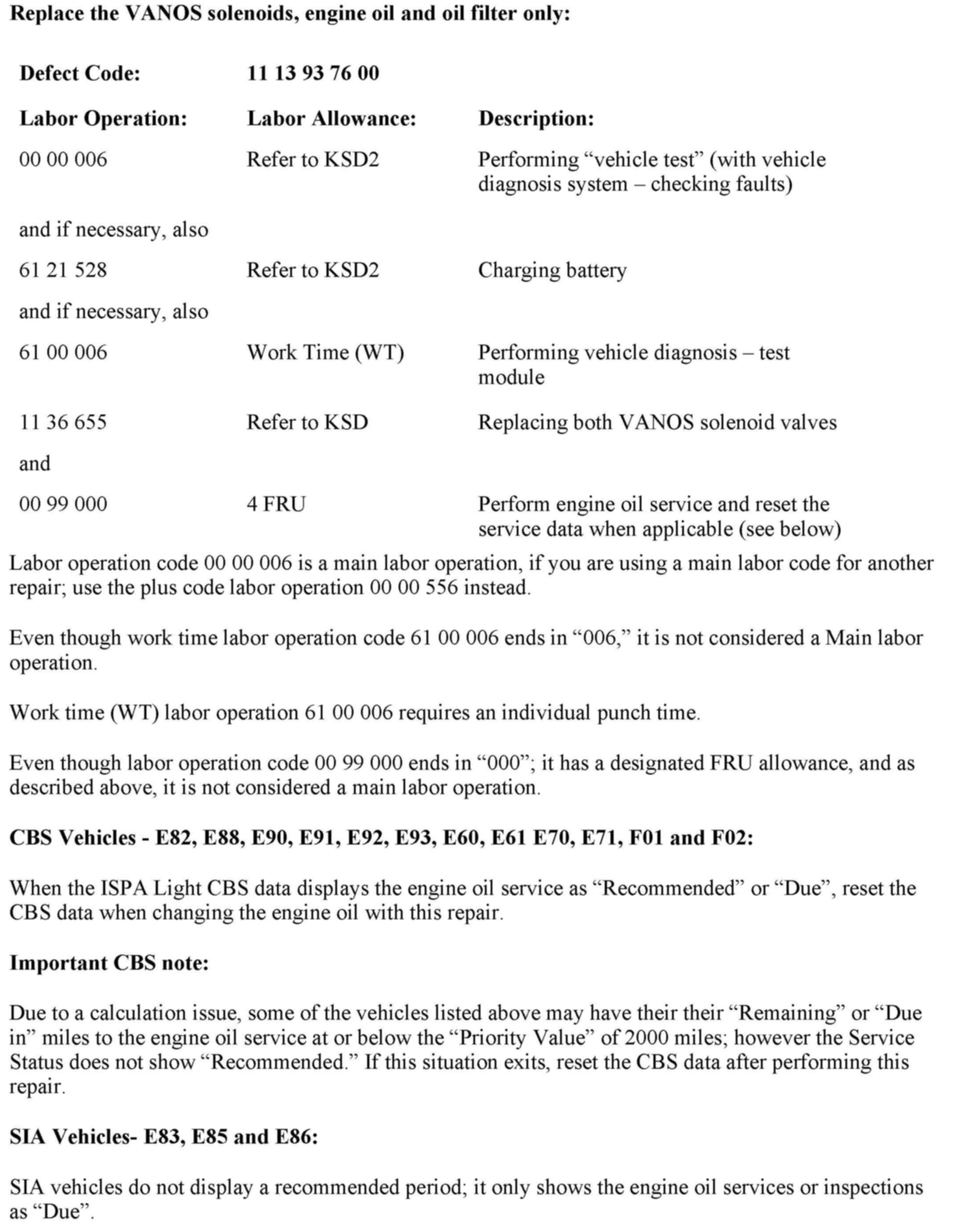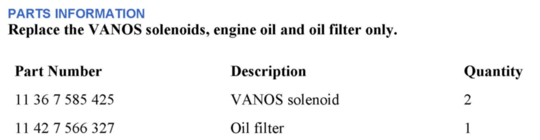 3. [NEW] Replace both VANOS solenoids, change the engine oil and filter, and reset the service data only when applicable, as outlined in the Warranty Information section. Drive the vehicle to verify effectiveness.