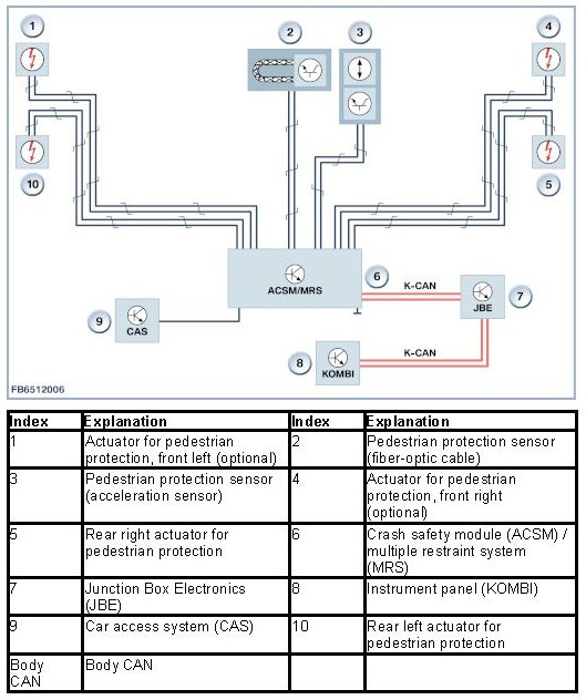 - Pedestrian protection actuator on front left and pedestrian protection actuator on front right The actuators are not installed in all model ranges and models, for example not E8x and E92/E93 M3. When the crash safety module or MRS control unit transmits a trigger signal, the actuators are triggered as follows: The ignition squib in the pyrotechnic component ignites the propellant charge. The pyrotechnic actuator contains an ignition squib whose propellant charge shifts a plunger with bolt to unlock the engine compartment lid catch.