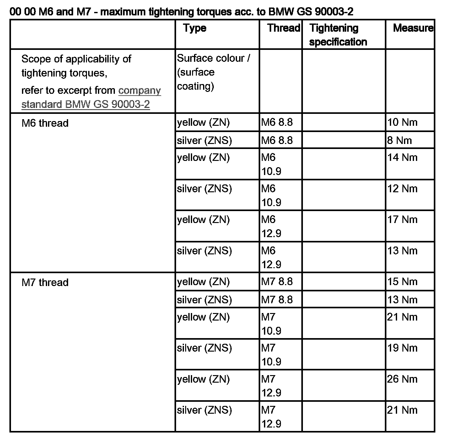 00 00 ... M6 and M7 - Maximum Tightening Torques Acc. to BMW GS 90003-2