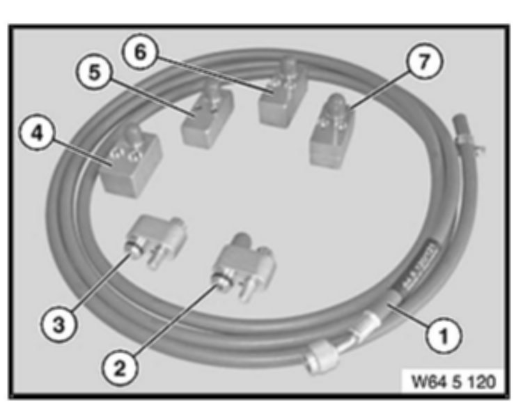 4. A special testing adapter set (64 5 120) has been developed, which allows pressure testing of the air conditioning evaporator and condenser while they are still installed in the vehicle.
