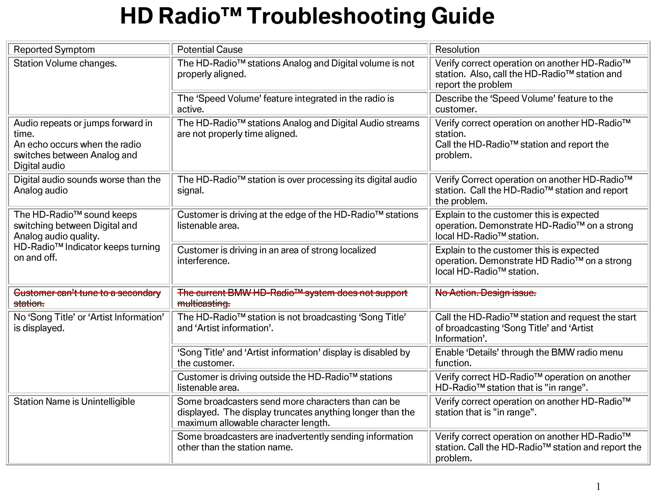 1. Verify the customer complaint and attempt to duplicate the problem. Find out if the problem occurs on AM band, FM band or both. Refer to the attached HD radio(TM) Troubleshooting Guide (updated).