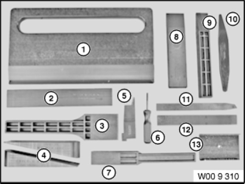 NOTE: (Panel wedges (set in plastic case)) For straightening and installation work on the vehicle, e.g. feeding in trim panels, removing window cavity strips, removing minor dents, removing adhesive residue, measuring gap widths, levering out trim panels - 13-piece [Released]