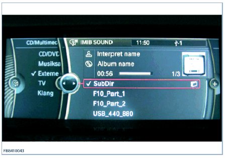 IMIB SOUND must be selected via the controller in order to display and play the music files. Check volume control in vehicle. A total of 3 media files and a sub-directory (SUBDIR) with contents are offered. To find the subdirectory, select IMIB SOUND and then select Browse directories. In vehicle with a Combox, album cover information is displayed in the form of a graphic as well as the media descriptions (genre, album and track).