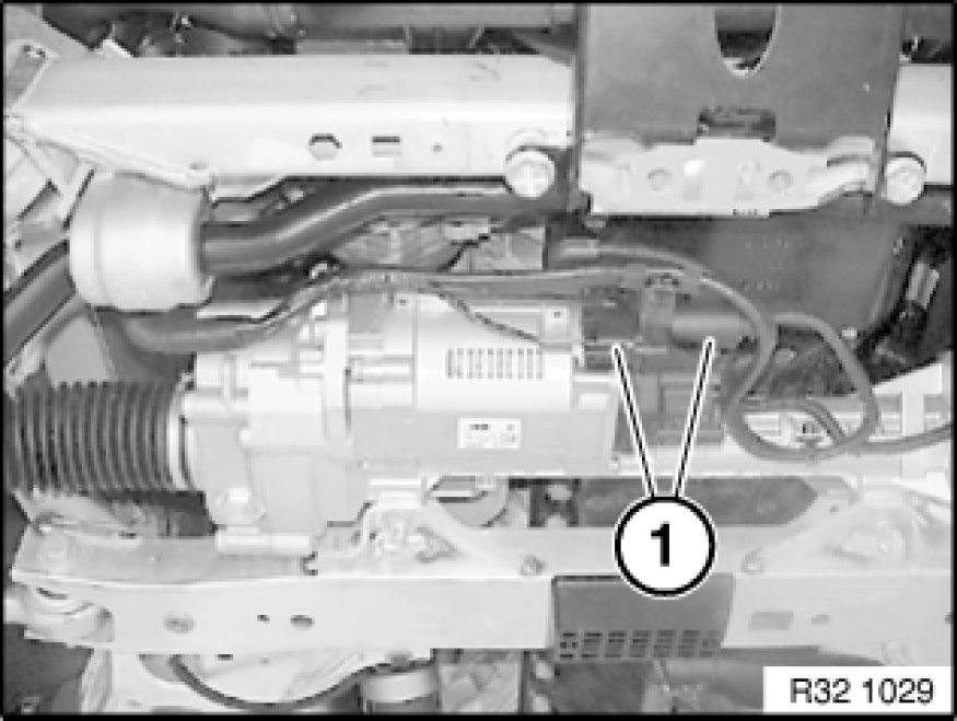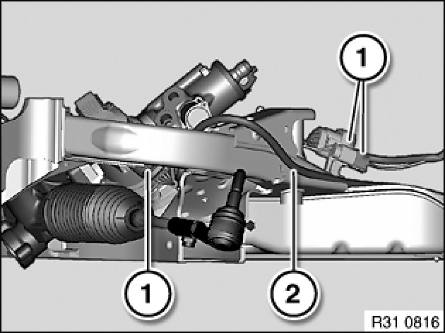Disconnect plug connections (1) and unclip connecting line (2) from front axle carrier.