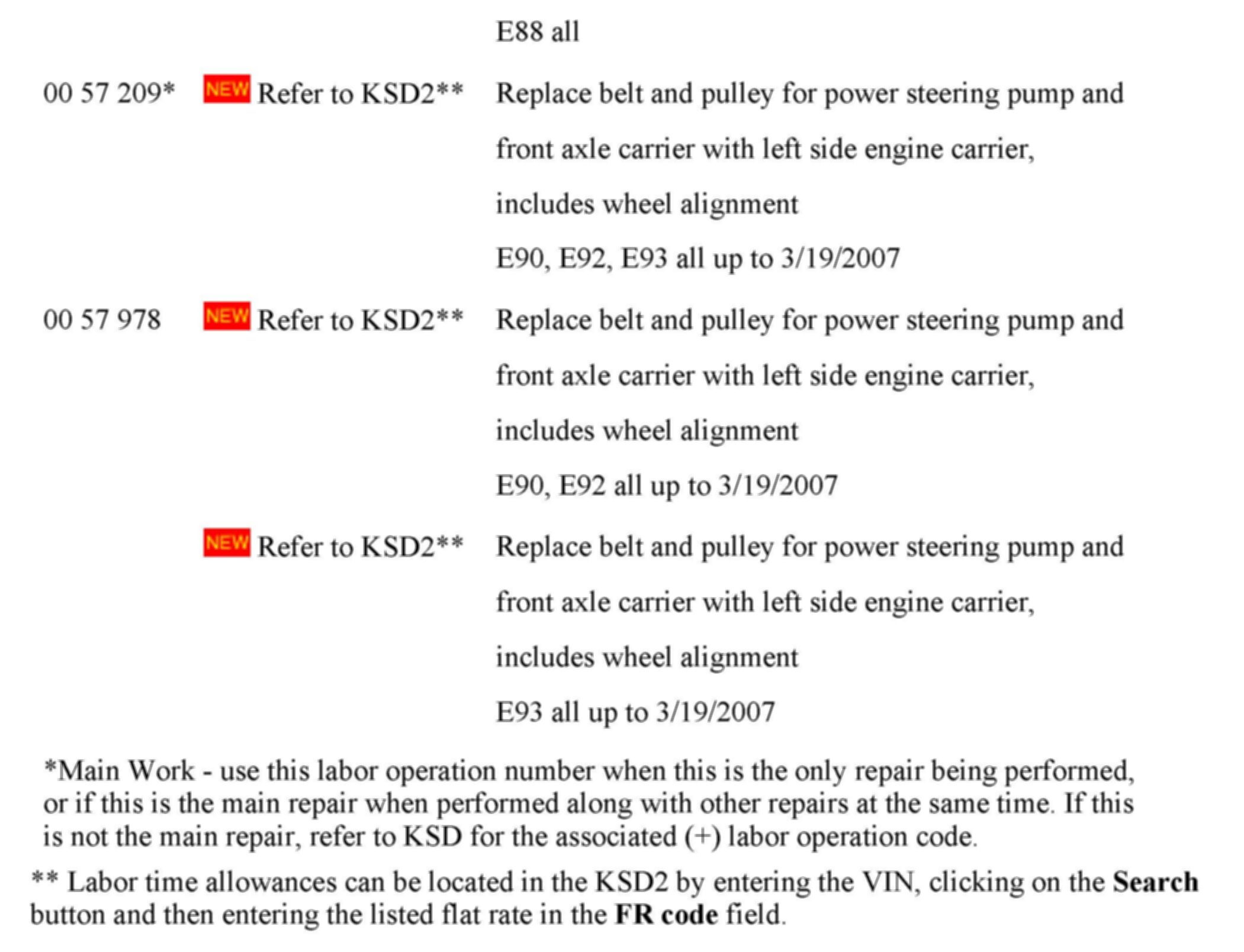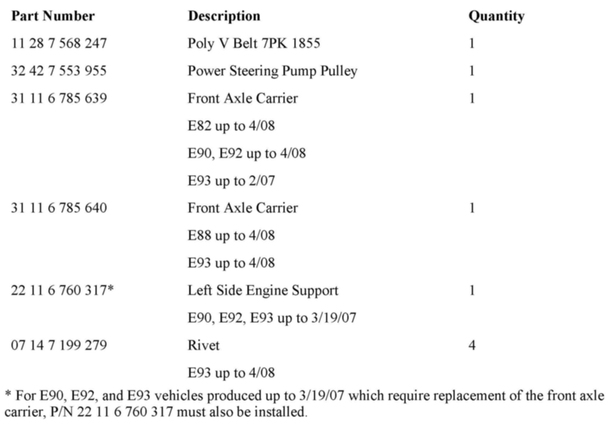 4. If the axle carrier has any sign of contact, then the carrier must be replaced. For E90, E92, and E93 vehicles produced up to 3/19/07 which require replacement of the front axle carrier, the left side engine support (P/N 22 11 6 760 317) must also be installed.