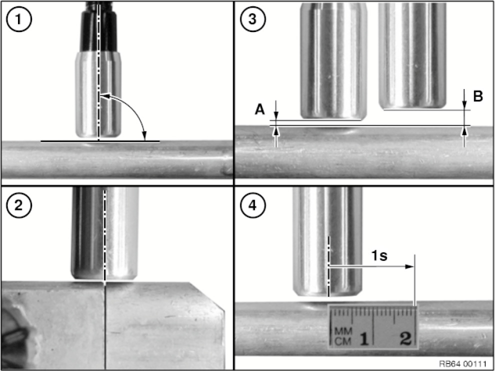 3. The optimal distance (A) between sensor head and surface to be checked must permanently be approximately 1 mm, maximum distance (B) at points that are difficult to access approximately 5 mm.