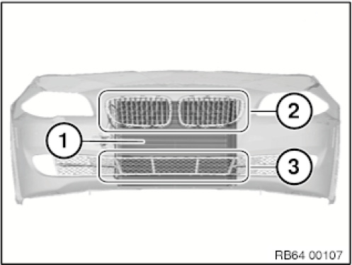 1. Visual inspection in the area of the ornamental grille (2) and air inlet grille, centre (3).