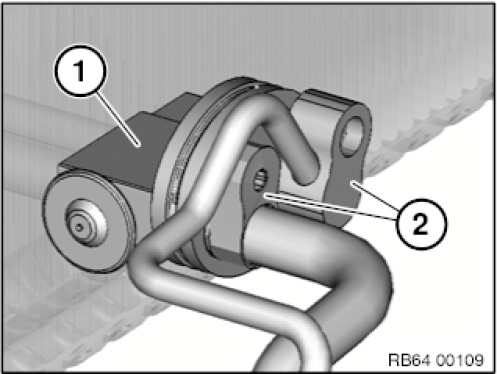 Check the connection point between the expansion valve (1) and refrigerant lines (2).