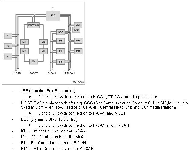 The following block diagram provides an overview of the control units and bus systems deployed in the vehicle.