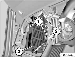 Release nuts (2) and remove footwell module (3).