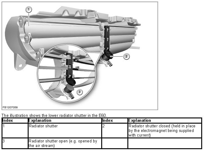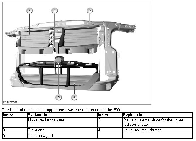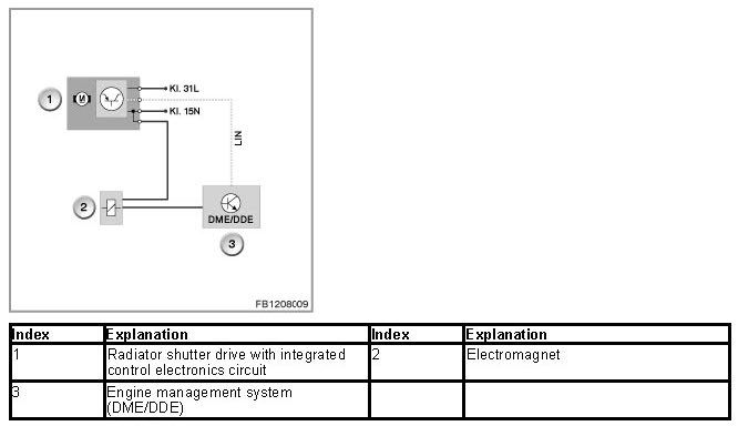 The radiator shutter drive is activated via the LIN bus by the engine management system (DME or DDE). The radiator shutter drive and electromagnet are supplied with voltage via terminal 15N.