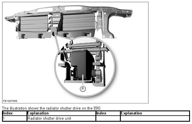 The radiator shutter drive is activated via the LIN bus by the engine management system. The radiator shutter drive is supplied with voltage via terminal 15N.