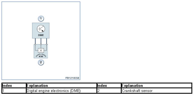 It is therefore not possible to define precise control limits. The engine speed is measured at the increment wheel assisted by the crankshaft sensor. The operational smoothness of the engine (misfire detection) is also monitored in addition to engine speed recording. In order to detect misfiring, the increment wheel in the Digital Motor Electronics (DME) is divided into segments based on the firing interval (between 2 ignition processes). The period duration of each segment is measured in the Digital Motor Electronics (DME) and statistically evaluated. The maximum permissible values for irregular operation are stored (as function of engine speed, load and coolant temperature) for each mapped value. If these values are exceeded for a specific number of combustion cycles, a fault entry is stored for each faulty cylinder detected.