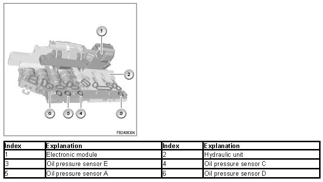 The oil pressure sensors are pressure switches that register any applied hydraulic pressure. The oil pressure sensors are installed in the valve block of the hydraulic control unit (hydraulic selector unit).