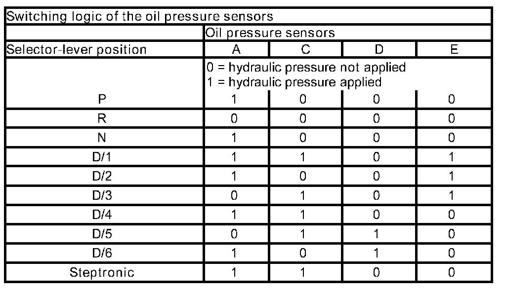 When hydraulic pressure is applied, the circuit is interrupted by the oil pressure sensors and no current flows. This results in different pressure states at the oil pressure sensors, depending on the shift mode of the gearbox. The electrical signals are sent to the EGS control unit.