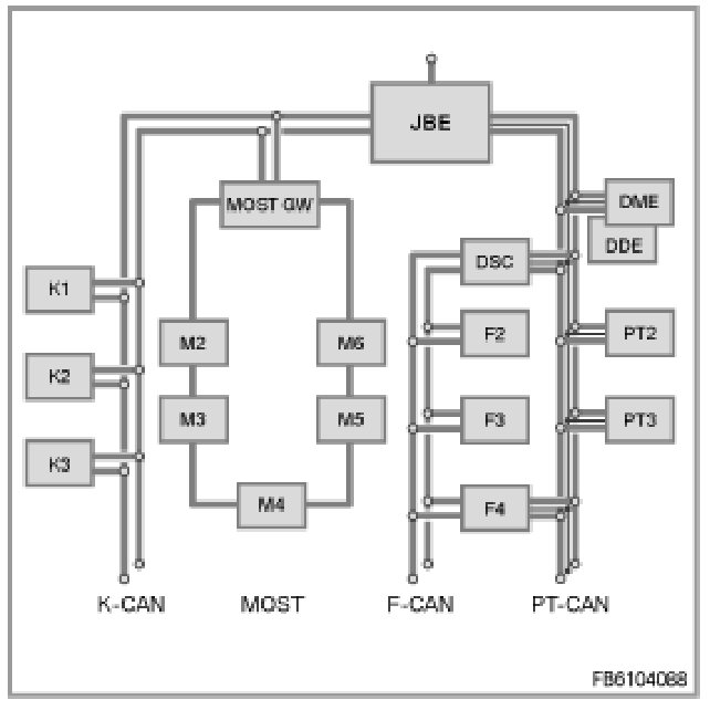 The following block diagram provides an overview of the control modules and bus systems deployed in the vehicle.