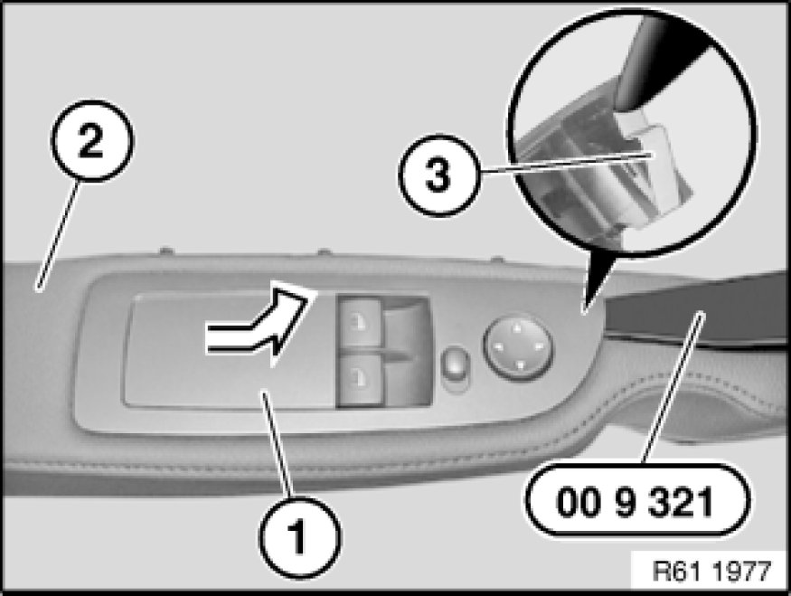 Insert special tool 00 9 321 between rocker switch for side window operation (1) and armrest (2). Unlock retaining clip (3) and lever out rocker switch for side window operation (1) in front area.