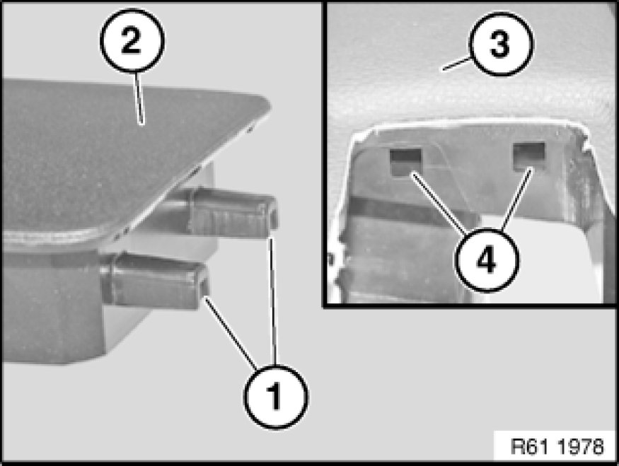 Retaining pins (1) of rocker switch for side window operation (2) must first be inserted into associated bores (4) in armrest (3).