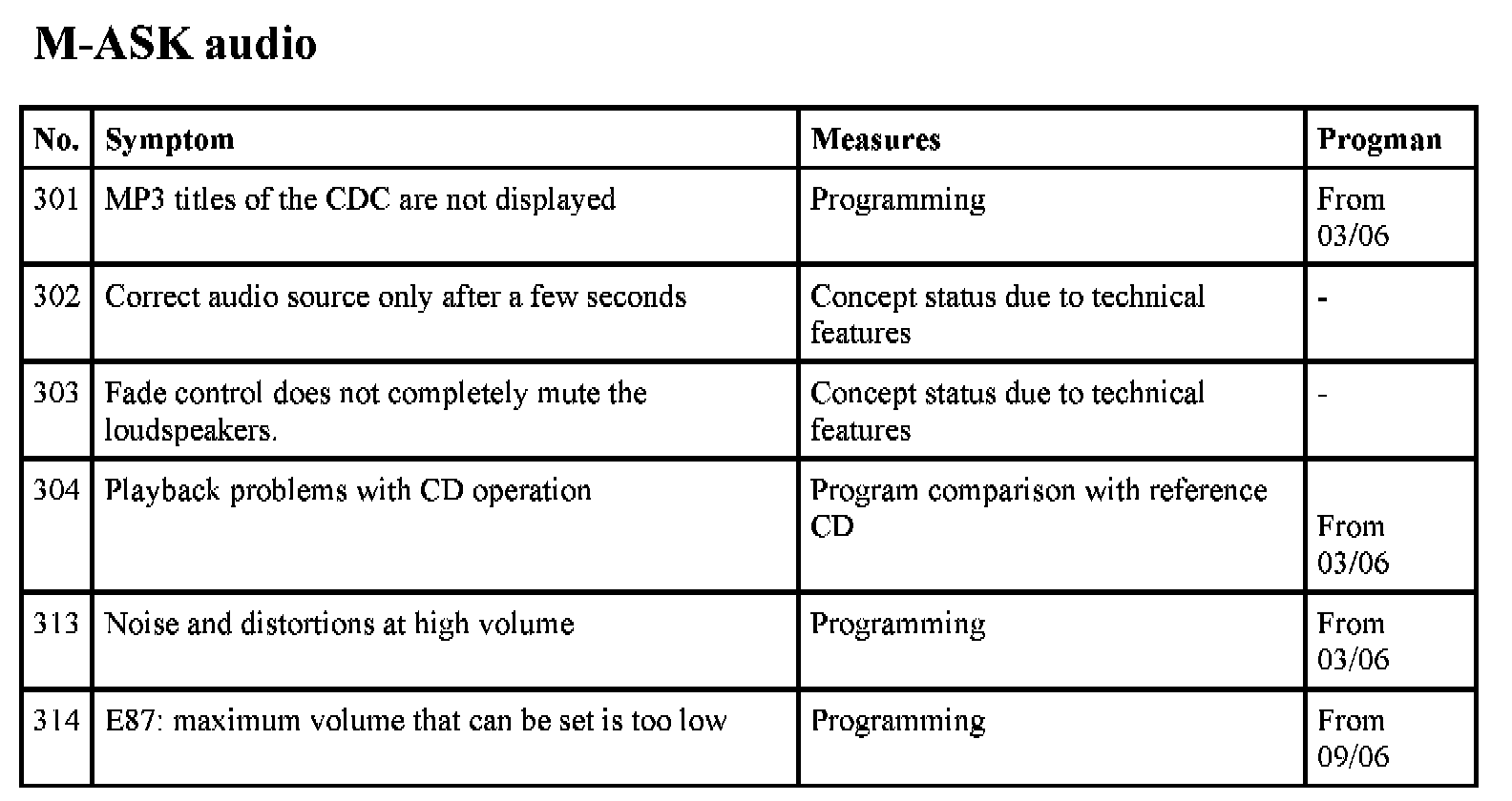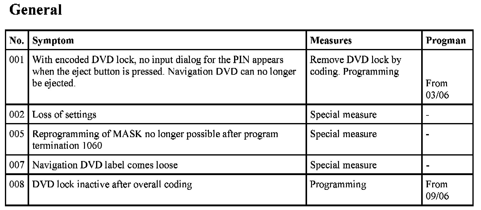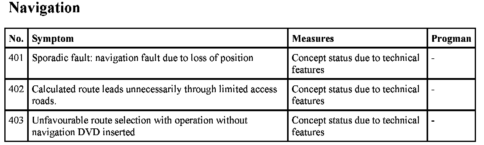 The navigation system Business (M-ASK) is a complex control module with a large number of possible fault profiles. The following list shows known symptoms in the functional area M-ASK audio and navigation. Fault profiles from the functional areas of telephone and Telematic services as well as integrated heating / air conditioner control are not covered in this test module.