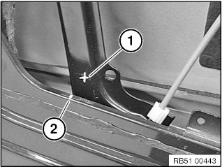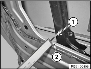 Mark measuring point on window lift rail (1) and inner door panel (2).