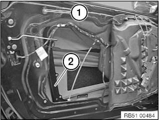 Determine distance between window lift rail (1) and inner door panel (2) and note down.
