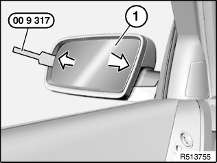 Unclip mirror glass (1) all around from outer side with special tool 00 9 317.