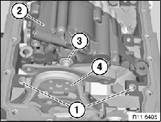 Slowly insert liquid sealing compound (1) with special tool 11 4 370 in direction of arrow.