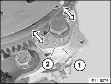 Make sure that the special tool (1) completely engages in the flywheel teeth (see arrow)