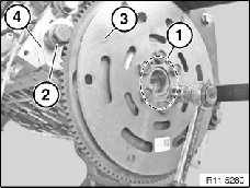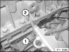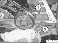 Secure flywheel with special tool (1) 11 9 260 and special tool (2) 11 9 266.