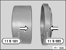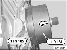 Pull on radial shaft seal with special tool 11 9 181 and 11 9 185 in combination with special tool 11 9 183.
