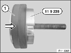 Push radial shaft seal (1) 11 9 235carefully in direction of arrow on the special tool.