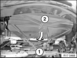 Unlock tabs (1) on front axle support and remove radiator cover (2) in direction of arrow.