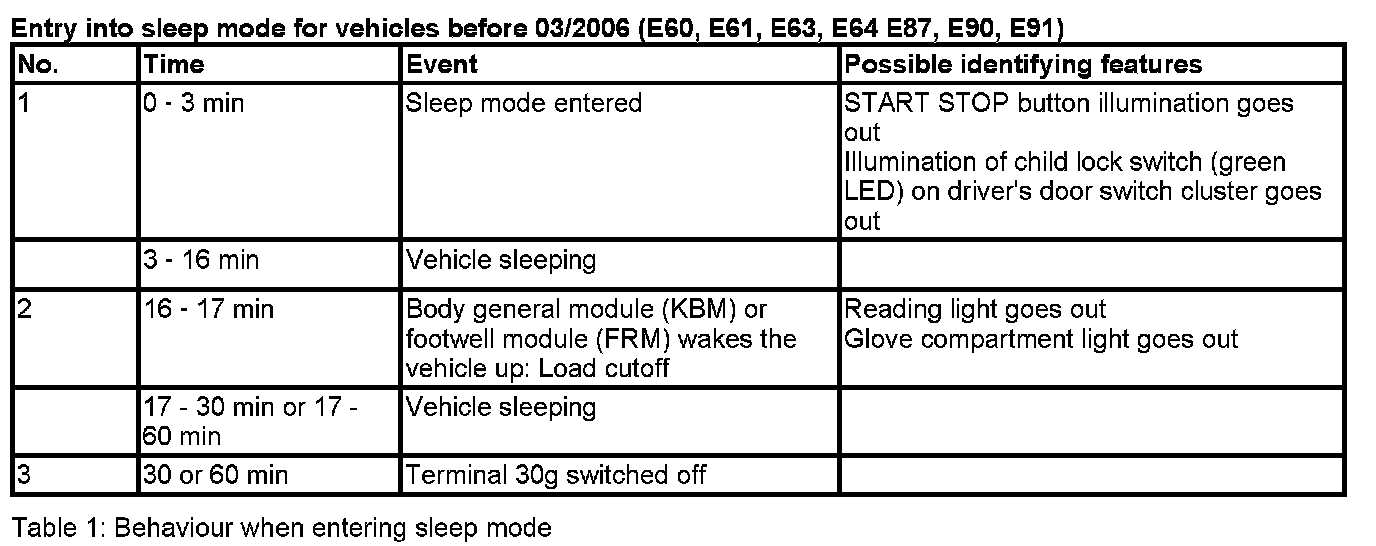 On R55, R56 and R57 the 2 additional wake-up causes due to the instrument cluster (KOMBI) may occur 40 min and 80 min after Terminal R is switched off.