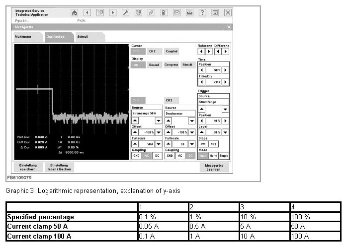 In the logarithmic view, the indication range always goes from 0 A to the maximum current clamp reading (full scale). The y-axis can be explained with the aid of the screenshot and the table below. There are no changes to the time range (x-axis) compared with the linear view.