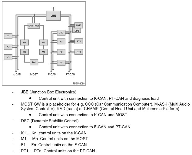 The following block diagram provides an overview of the control units and bus systems deployed in the vehicle.