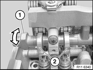If necessary, move eccentric shaft (1) on twin surface to minimum lift (2).