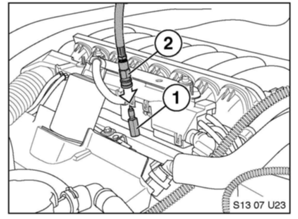 10. Disconnect the fuel line from the fuel rail connection (1).