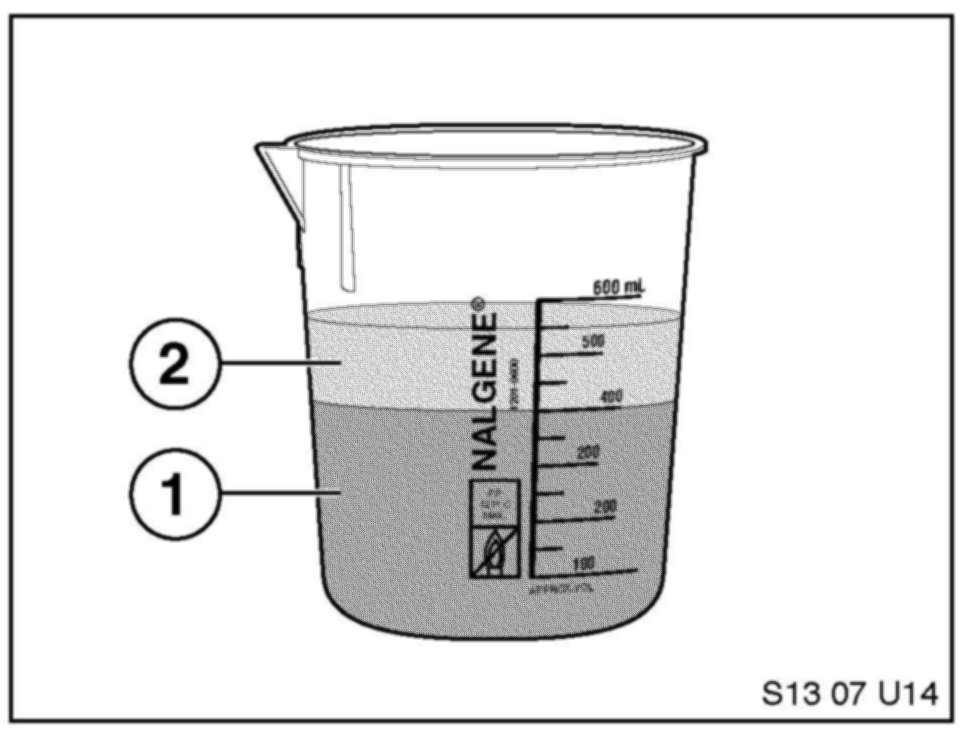 8. Pour 400 ml of fuel (1) and 150 ml of cleaner concentrate (2) into the beaker supplied in the kit.