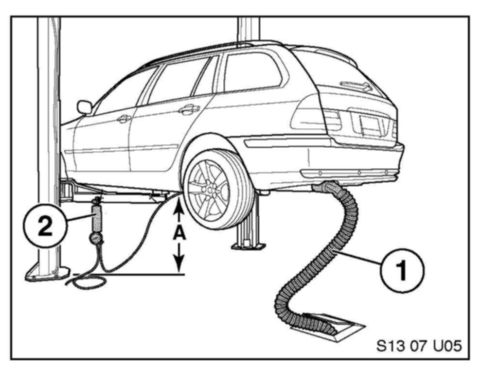 8. Lower the vehicle on the lift to a safe height (A) whereby the applicator or hose (2) is not damaged. Install the Exhaust Removal System (1). The illustration shown is not the actual vehicle.