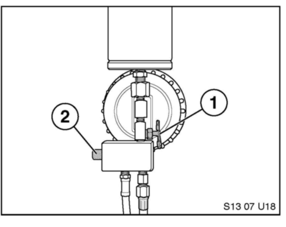 11. Release the pressure from the applicator cylinder with the pressure release button (2). Close the shutoff valve (1).