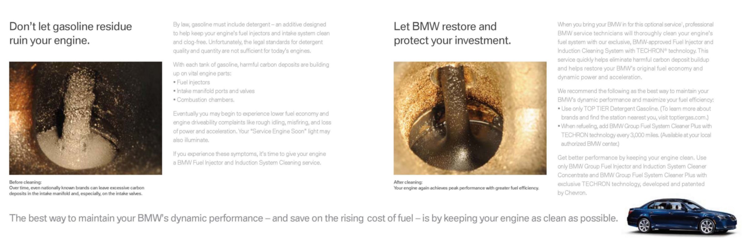 In order to help you explain fuel quality and carbon deposit-related topics to your customers, BMW NA has published a customer brochure: "BMW Fuel Injection and Induction System Cleaning: Restore your BMW's peak performance and fuel efficiency". A copy of this brochure is attached.