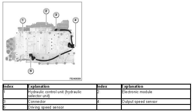 The drive and output speed sensors are Hall sensors. Both sensors are located on the upper timing case. They are connected by means of a wiring harness and a connector with the EGS control unit.