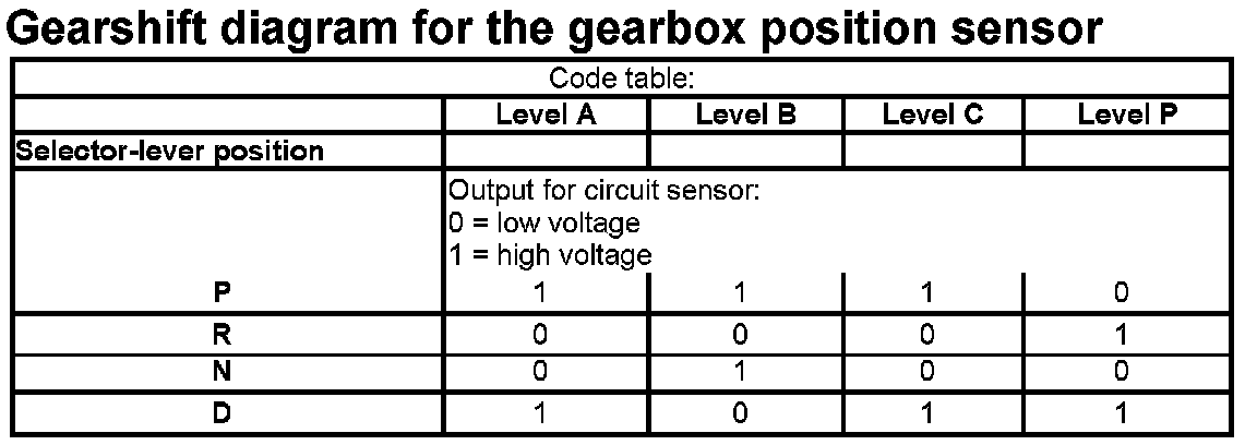 The 5 inputs of the gearbox position sensor show each selector-lever position. The selector-lever position is transferred to the gearbox position sensor across a Bowden cable and is converted by the gearbox position sensor into a code. This code is transferred to the gearbox control and engine management system.
