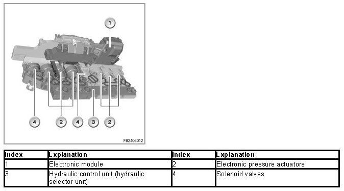 The clutches of the automatic gearbox are hydraulically controlled in the hydraulic selector unit.