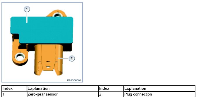 The zero-gear sensor is mounted on top of the gearbox housing. The zero-gear sensor detects the idle position of the gearshift lever.