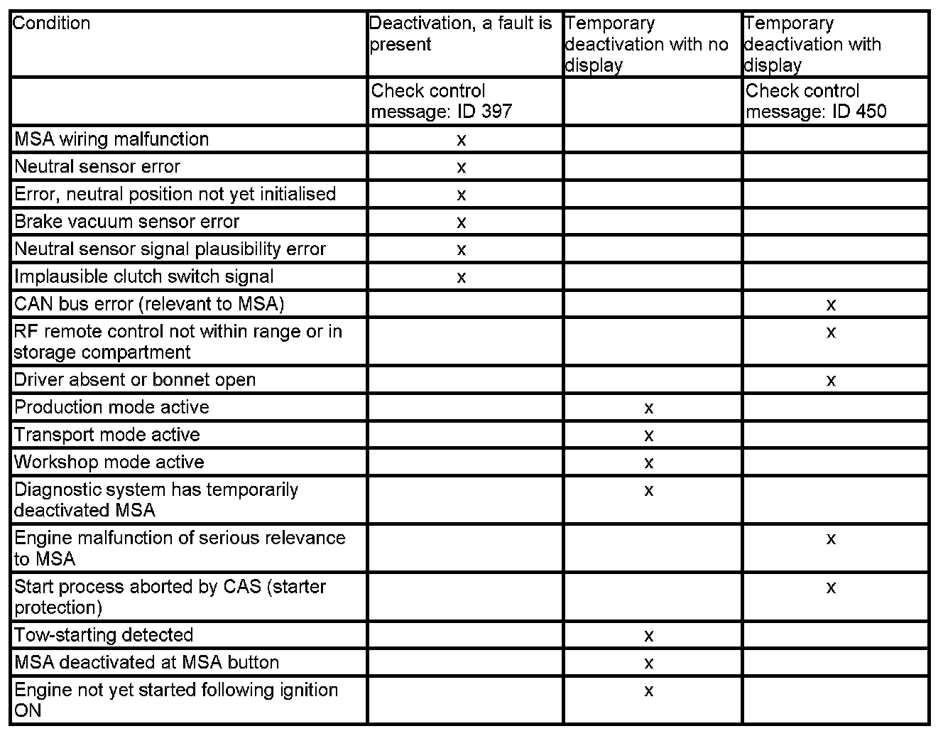 During diagnosis sessions the MSA is temporarily deactivated owing to safety considerations (remains deactivated until next change in terminal power status). This is to avoid a possible automatic engine start while service work is being performed in the engine compartment. The temporary deactivation status remains constantly visible as "MSA deactivation detected" in the control unit functions. If the control unit functions fail to recognize a vehicle with MSA this is visible as "MSA installation check" and/or "MSA code status".