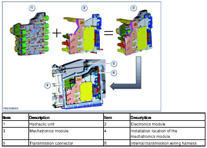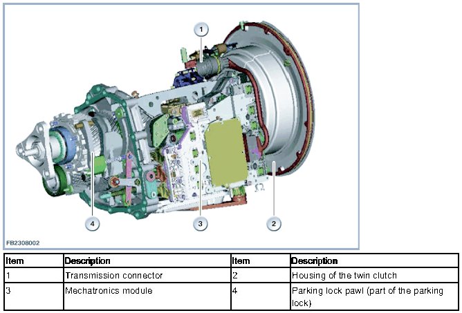 The twin-clutch transmission is controlled by the mechatronics module. The mechatronics module is a combination of hydraulic unit and electronics module. The mechatronics module is installed in the twin-clutch transmission.