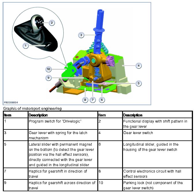 The gear lever switch is configured as a control unit in its own right. The twin-clutch transmission is electronically activated via the gear lever switch. The gear lever switch is supplied with voltage via terminal 30g. The gear lever switch consists of the control electronics and the gear lever. 14 hall effect sensors for non-contacting detection of the gear lever position are integrated in the control electronics circuit. The gear lever position is sent across the PT-CAN and redundantly across the LIN bus to the DKG control unit (also referred to as: transmission control unit). This means that data are sent to the DKG control unit even if one of the two transmission lines fails. The moved program switch for "Drivelogic" is connected directly to the control electronics circuit of the gear lever switch.