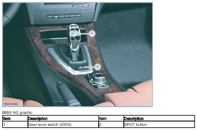 The functional display is active as long as the bus communication on the PT-CAN or LIN bus is active. The gear lever is monostable, i.e., it always returns to its initial setting. The change to the "R" gear lever position is bi-stable, i.e., the gear lever remains in the selected gear lever position. A shift from the gear lever position "R" into the automated drive mode "D" or the sequential mode "S" can only be carried out manually.