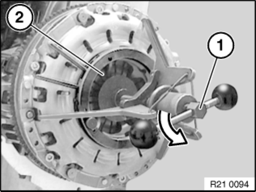 Locking hooks (1) of special tool 21 2 180 must engage in openings in SAC clutch.